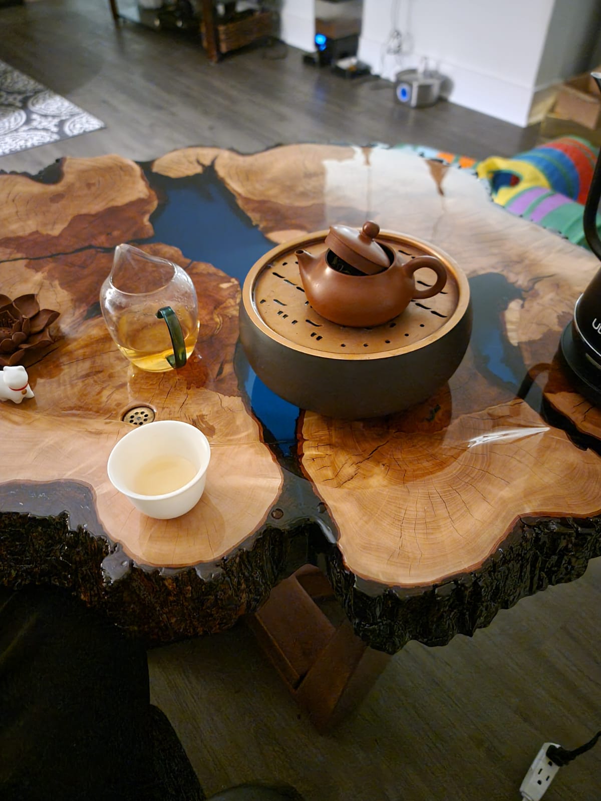 Hey guys, Not sure how to decribe this feeling. It’s absolutelymind blowing. Three years ago Don from @mei_leaf show his new tea table made in Poland by Marek from @resinwoodsdesign. Marek and Don together designed this style of tea tableand if I saw video from Don, I was very excited about this style of tea table. I never thought that I ever would have such a table, but now table stands in my room. The table is made out of ashh wood and a turquoise resin. It’s looking very dark at the pictures, but if the sun hits the table, the color is visible. On top is mat foil. I have not more words about it. It’s crazy. I want to thank Marek who really is such a lovely and kindful person. He invite me inevery process and send me pictures and videos all the time with question etc. It was a pleasure Marek. Thank you so much