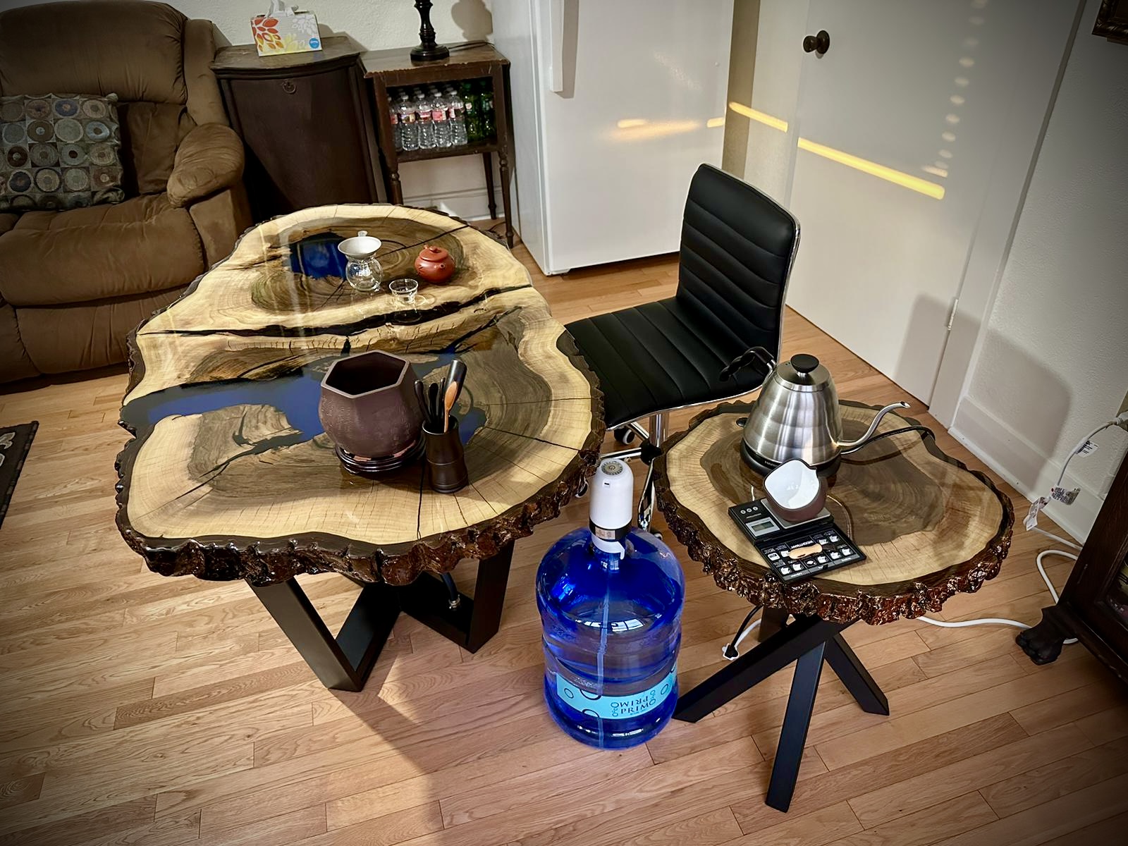 Absolutely great! After long three months of sharing ideas and working together, Marek and I are extremely happy to see how my two tables finally came out tobe – from slabs to master pieces. It is amazing to see how both big and small table have become. They perfectly match each other and complement one another. I guess I AM Marek’s FIRST customer who asked him to maketwo matching gong fu tables. I am very glad that I have asked Marek to do this marvelous project and it is worth to wait three months to get the job done. I’m very pleased with pur whole proces of the project from selecting slabs to putting our ides together. Every since they were delivered to my door, I sterted using them right away. I really enjoy using them to brew my favorite teas everyday. Having these tables not only made it easy to brew tea, but also to clean all the tools afterward. In addition, LED light function is awesome. It shows the color of the tea very reflective and makes its clarity visible. Again, Marek thank you for your hard works. Maybe next time I need to ask you to make a matching chair…hahhaha